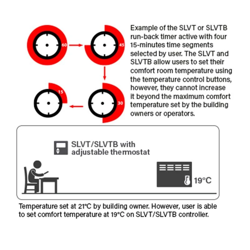 - – Temperature and Timer Control: Controller acts as a 4 stage run-back timer where heating period will be active until run-back timer expires. Target room temperature can be set using temperature control buttons.