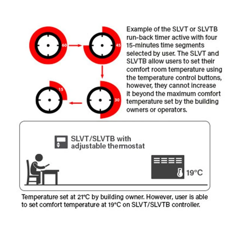 The SLVT has four status indicators and two operating modes which are set prior to the controller’s installation. It offers temperature control where users can set their comfort temperature using either one of the temperature control buttons, however, they cannot increased it beyond the maximum comfort temperature set by the building owners or operators. In Temperature and Timer mode, it acts as a 4-stage run-back timer where the heating period will be active until the run-back timer expires. There is a choice of three time periods available: 5, 15 or 30 minutes. When the button is pressed four times, this takes the run-back time period to 20, 60 or 120 minutes. In Temperature Control mode, it features temperature control for comfort and setback periods