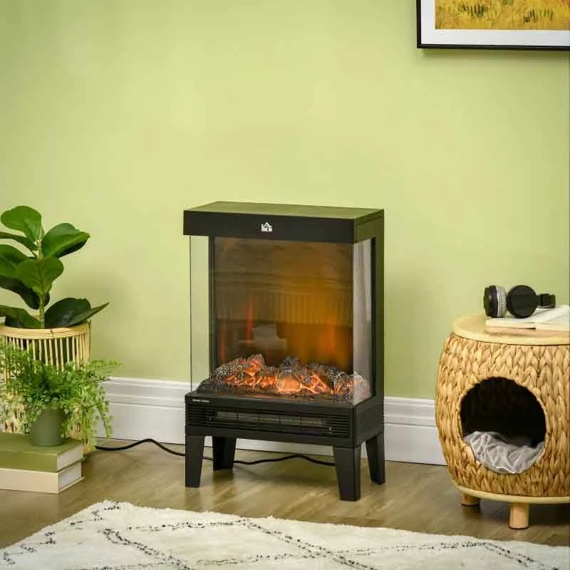 The HOMCOM 180 deg fireplace heater offers two heat settings (1000W/2000W) and a realistic charcoal-burning flame effect that can be adjusted independently.