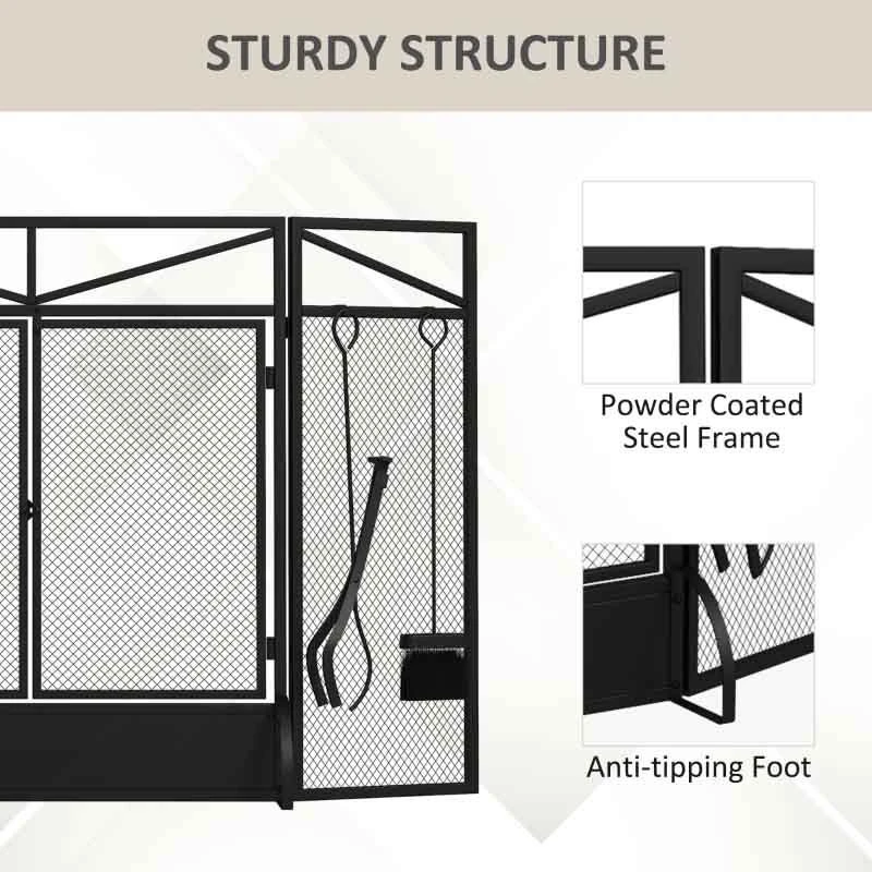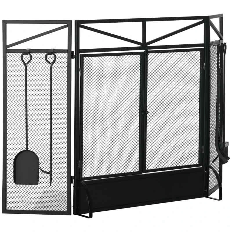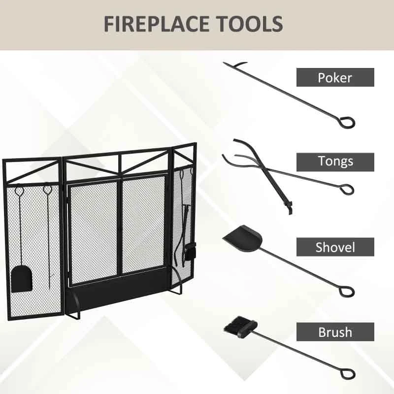 HOMCOM 3 Panel Folding Fireplace Screen with Tool Sets – Black – 820-391V00BK