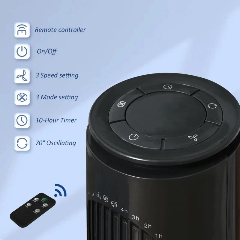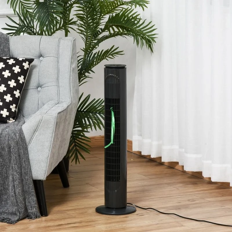 This HOMCOM tower fan keeps your home perfectly cool, featuring three speed settings and three wind modes that are easily changed via the useful remote control or adjusted on the unit. This fan has oscillating movement that pumps air over a greater area keeping the whole room cool and the 10-hour timer allows you to set a specific time for the standing fan to stop – ideal for using at night.