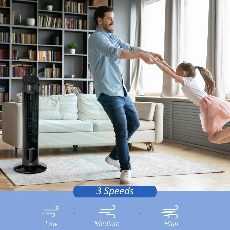 - Modern look freestanding tower fan that fits a living room, bedroom, office environment