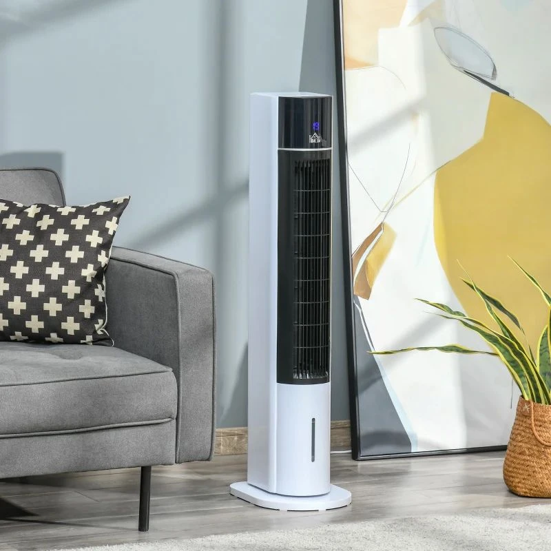 This air cooling unit from HOMCOM provides you with instantly cooled air flow, perfect for hot summer days and nights. This unit comes with three functions and is fully mobile, the fan unit ventilates, ice cools the air and humidifies. This fan cooler uses unique cooling technology to turn the surrounding air even cooler and fresher. With a 52ยบ oscillation, you are able to cover a larger area and its swivel casters provide easy movement.