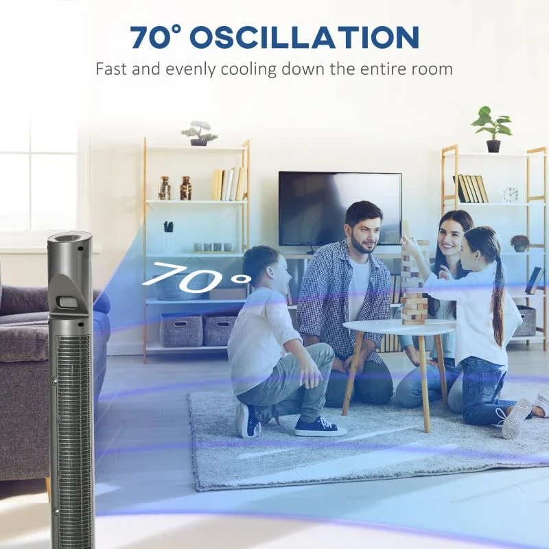 This HOMCOM tower fan keeps your home perfectly cool, featuring three speed settings and three wind modes that are easily changed via the useful remote control or the digital display on the unit which also displays current temperature. This fan has a 70ยบ oscillating movement that pumps air over a greater area keeping the whole room cool and the 12-hour timer allows you to set a specific time for the standing fan to stop โ ideal for using at night.