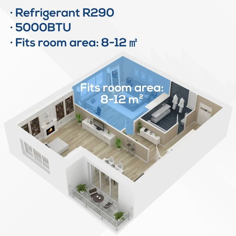 - Powerful R290 refrigerant and 9000 BTU instantly cools your room