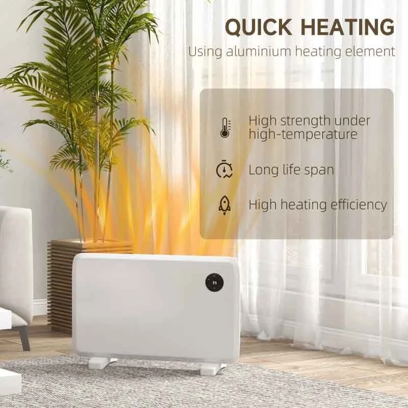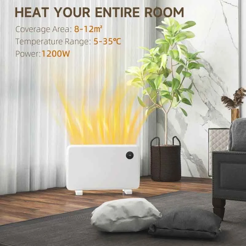The HOMCOM 1200W Electric Convector Heater is a sleek and modern space heater that provides ample heat for evenings. Its slimline build and neutral colour make it easy to adjust the temperature between 5-35ยฐC, and it features an LED screen for easy viewing.