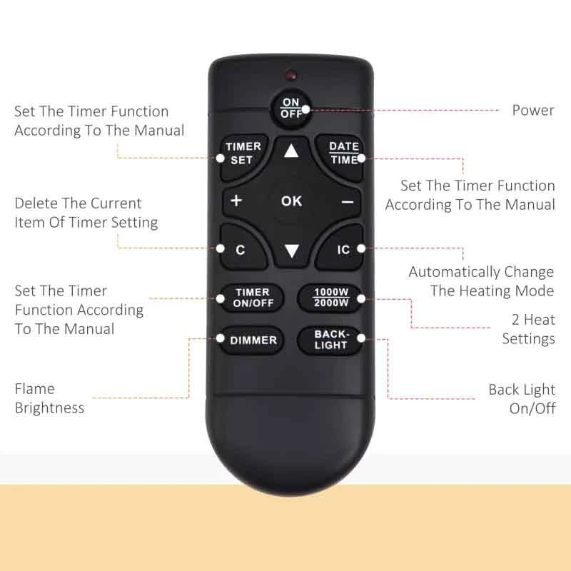 The fireplace has two heat settings, 1000W and 2000W, so you can choose the amount of heat that is right for you. It also comes with a remote control for easy operation.