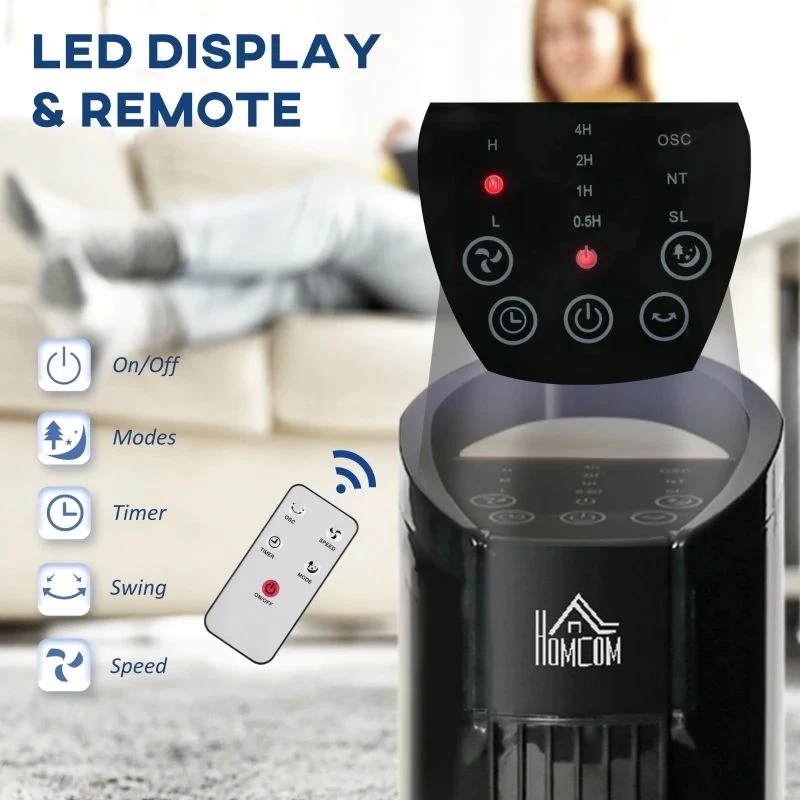 This sleek looking HOMCOM electric oscillating standing fan features 3 variable speed settings and 3 modes to meet varying cooling requirements. The useful 70ยบ oscillation function directs air flow to where you need it most, whilst the 7.5-hour timer allows you to schedule a cooling cycle to save energy. This fans LED panel and remote controller provide an easy operation and the screen can be turned off to avoid any light disturbance at night.
