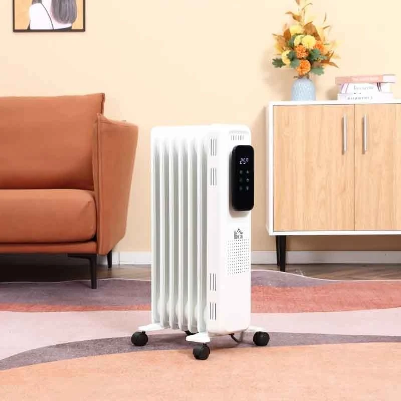 The HOMCOM oil-filled radiator heater, featuring 7 heating pipes, is ideal for keeping your bedroom, living room, home, or office warm during icy weather. With three power settings (low, medium, and high), it provides easy temperature control.
