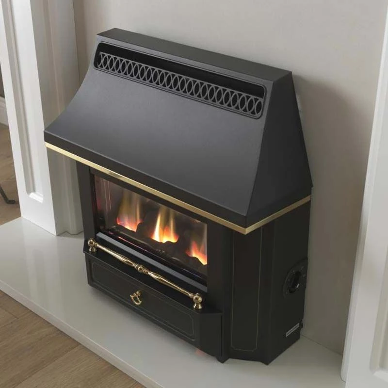 This model features a manual side control for easy operation and is available in a black finish with brass detailing. The realistic flame picture and glow add ambience and character to any room setting.